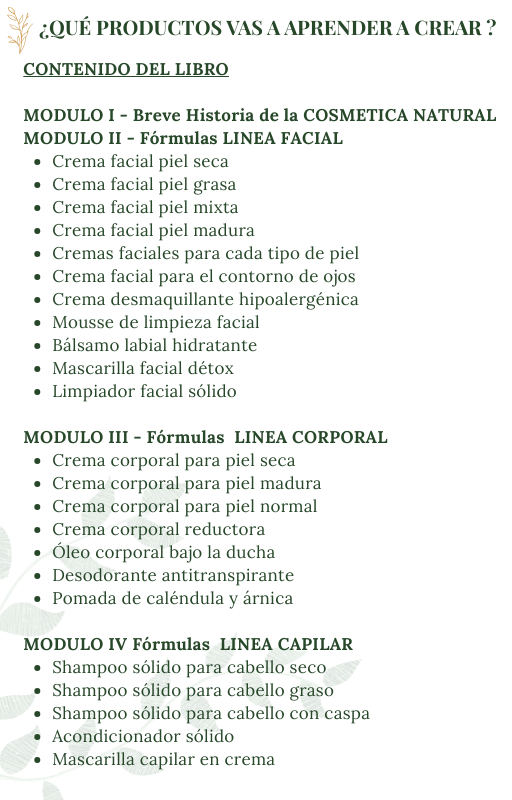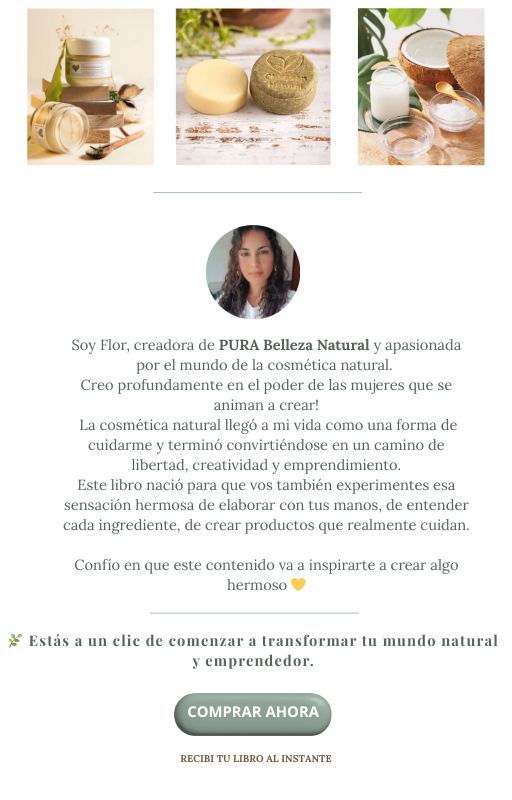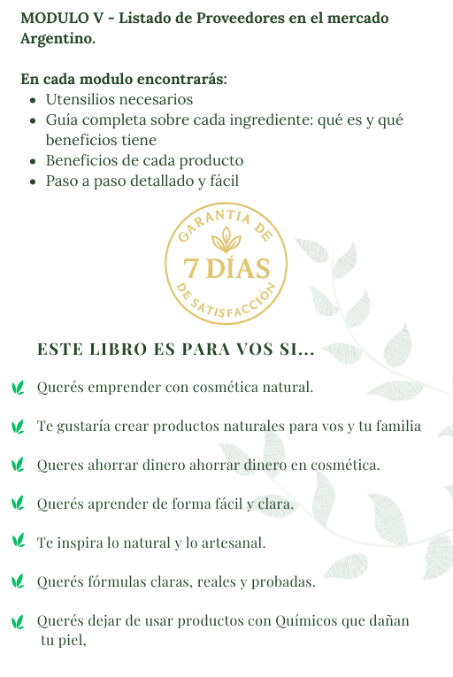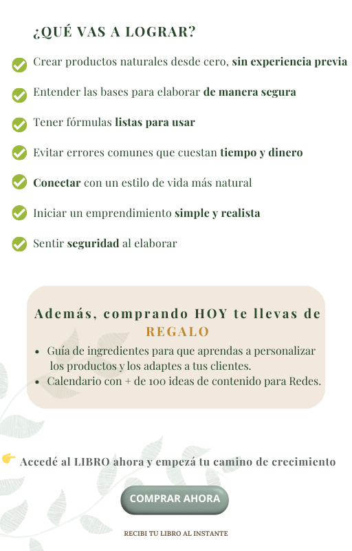 Son recetas de cosmética natural descargables en formato digital, que podés imprimir o consultar desde tu computadora, tablet o celular. Cada receta está elaborada con ingredientes naturales y fáciles de conseguir en el mercado Argentino.